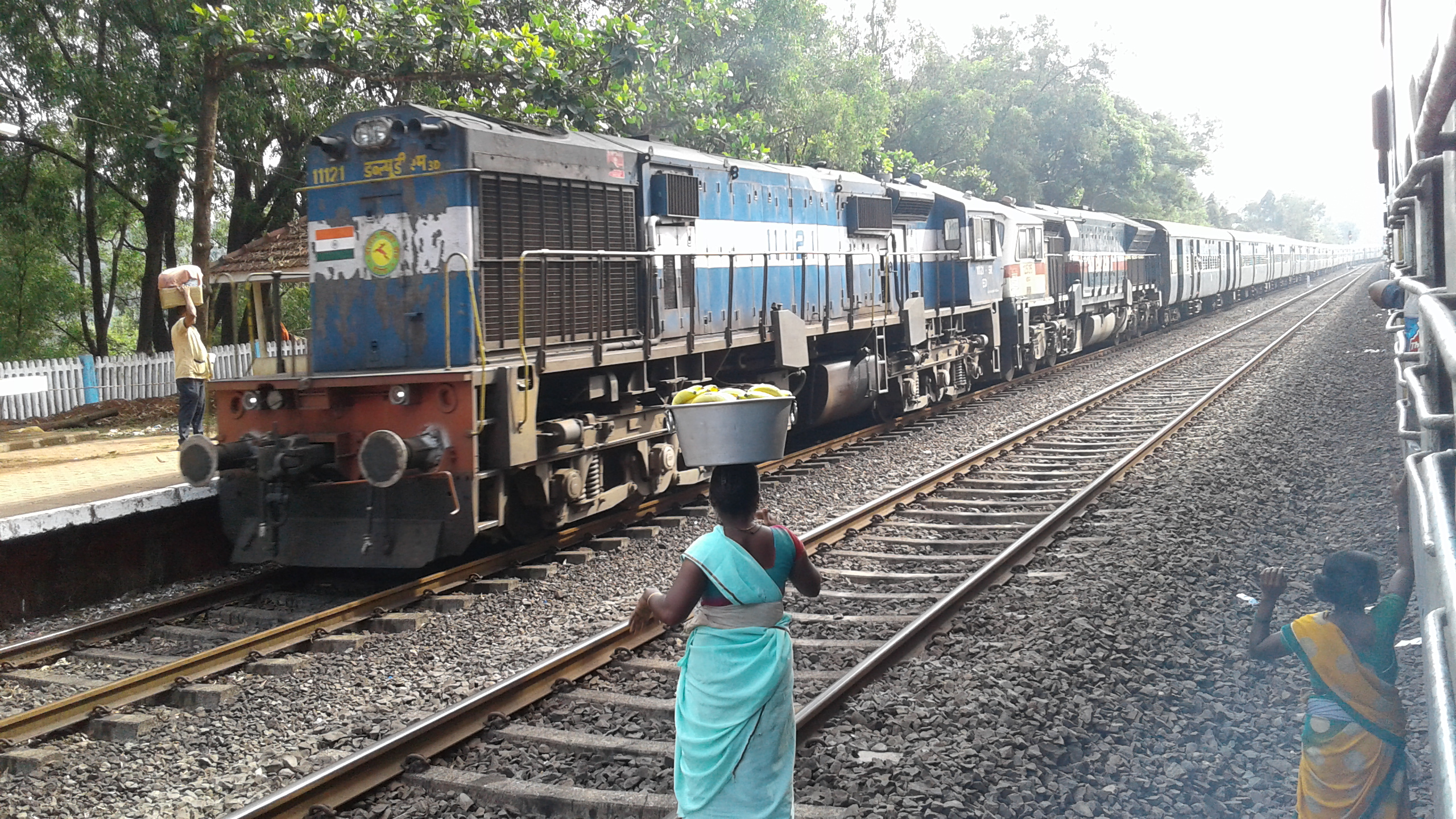 True to the title of this blog post, it was a leisurely ride by the ‘Food King’ of IR (10103 CSMT-MAO Mandovi express) so far; as we were often held up for crossings involving long halts of at least 10-15 mins and thus the delays kept increasing. We were running 44 mins late when we departed from Chiplun at 12 42. For an account of our progress till then, please refer https://ashwinkumar1989.online/2018/12/12/a-leisurely-sojourn-by-the-food-king-part-1/ . We crossed the beautiful Savitri river with an island in between and blasted through more scenery, before slowing down in a very long tunnel; for an unscheduled halt for a crossing at the very next station Kamathe.