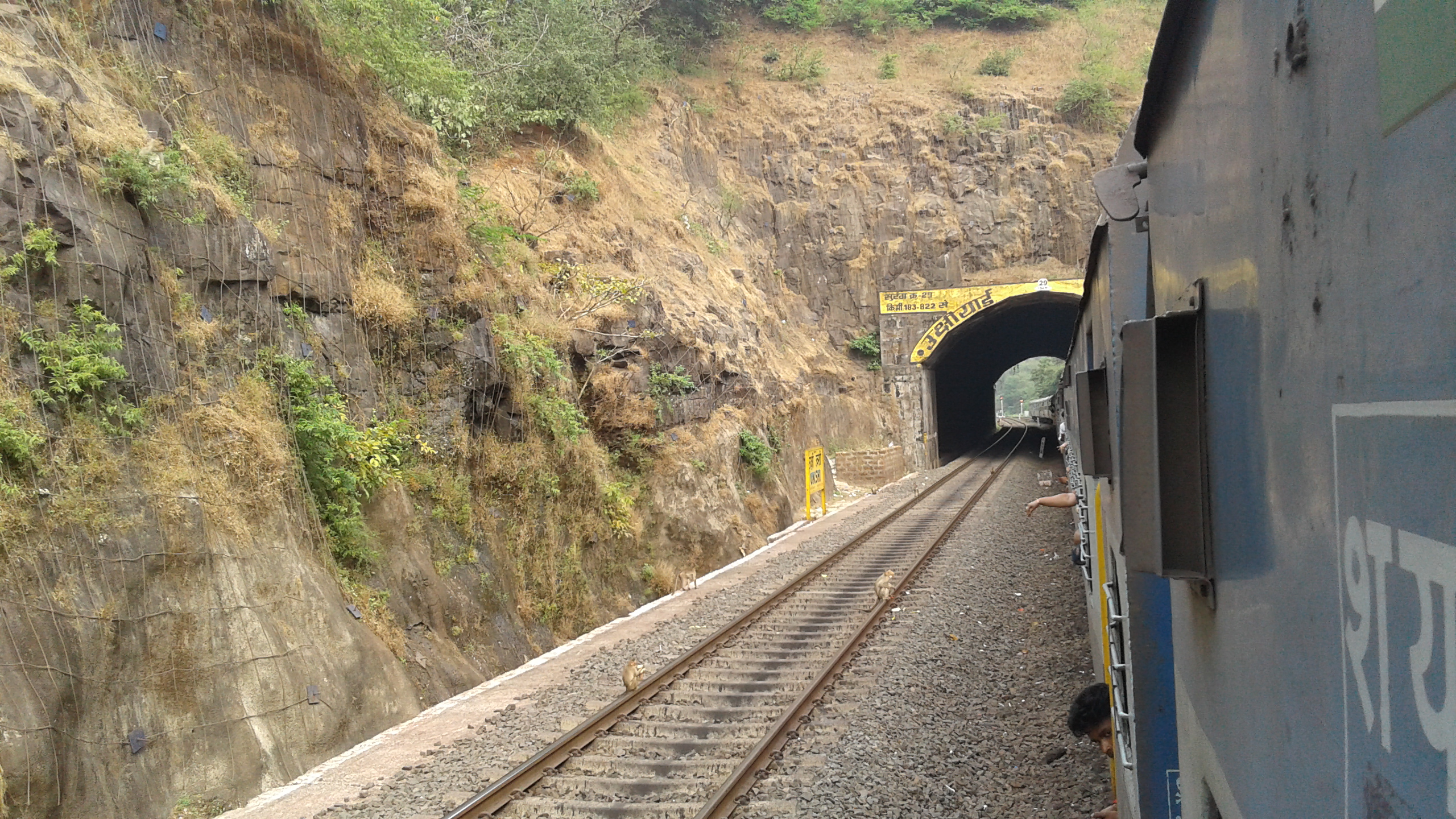 Pulled into Platform 1 of RN at 15 07, 1 hour 52 mins late. Our counterpart (10104 MAO-CSMT Mandovi express) arrived on PF2 at the same time, 1 hour 7 mins late; behind KYN WDG4 12761. Both LT and HT horns were sounded as we departed after a stop of 6 mins. After some time, I could barely hold my breath; as a truly nasty smell from a factory nearby engulfed our nostrils! :O The LT horn was sounded more often now, as we took a massive curve to the left. The stretch that followed was pure bliss, with many tunnels and tall viaducts (including the famous Panval Nadi viaduct).
