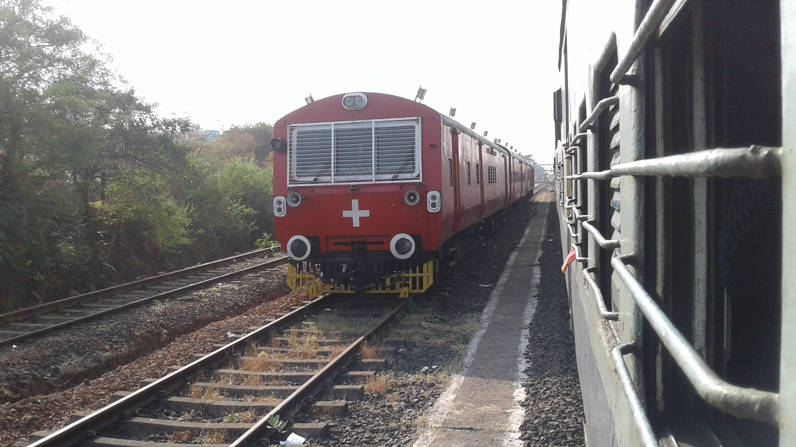 There was another unscheduled stop for a crossing at Aravalli Road, which was again almost like a ghost station! :O KZJ WDG4 12548 rushed past with a RO-RO rake. Here also the wait lasted only 6 mins. The tunnel spree continued, accompanied by a viaduct over partly dry river and beautiful greenery; with the mountains (as ever) in the distant background. I observed a “chis-chis-chis-chis” sound coming from the tracks many times at higher speeds! :O I have for long wondered (without success) about the cause of this phenomenon. We reached Sangameshwar Road at 13 48, 1 hour 13 mins late. It was an extremely picturesque station, fully surrounded by greenery and trees 🙂 . The mainline had an MPS of 110 kmph! :O Here we had a massive wait of 21 mins, as 50106 SWV-Diva passenger came slowly and made its halt.
