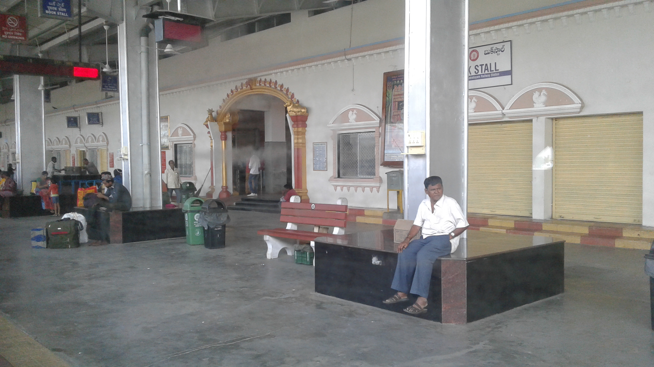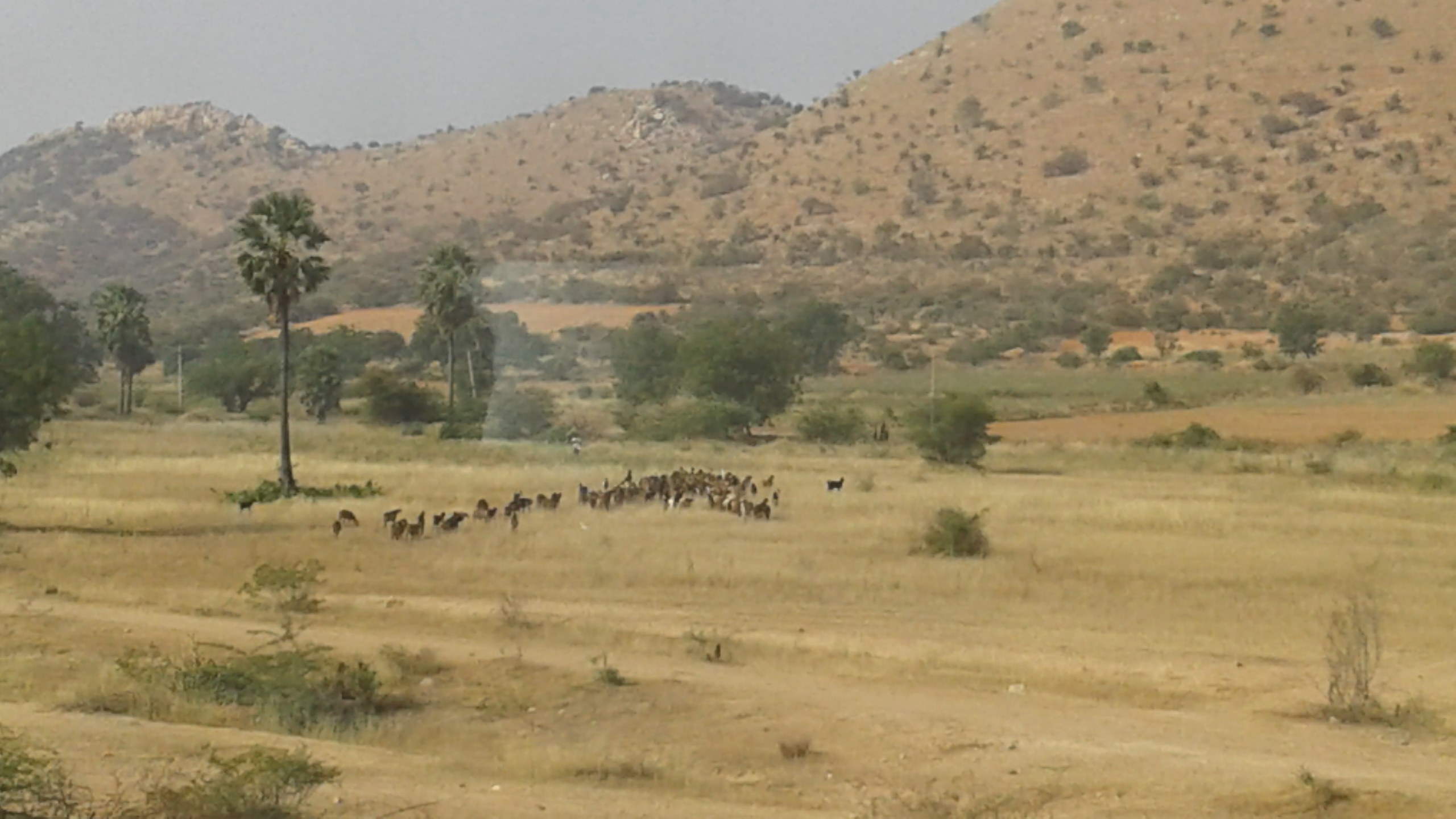 There was yet another unscheduled stop on the mainline at Mantampalle for 3 mins. Then there were steep mountains, followed by herds of goats, sheep and lambs; before the culprit for the halt at Mantampalle was revealed at the very next station Nandalur – another freight which we had to overtake through the loop. Typical of SCR! 😛 This was followed by another bridge over a dry river with a sand bed; spotted a family huddled together near a fire down there! :O Then there was another predictable unscheduled stop on the mainline at Razampeta; where 12793 TPTY-NZB Rayalaseema express made a scheduled halt. It left before us and accelerated quickly out of the station. Then we departed after a stop of 9 mins; once again with melodious twin tones blown by the LP.