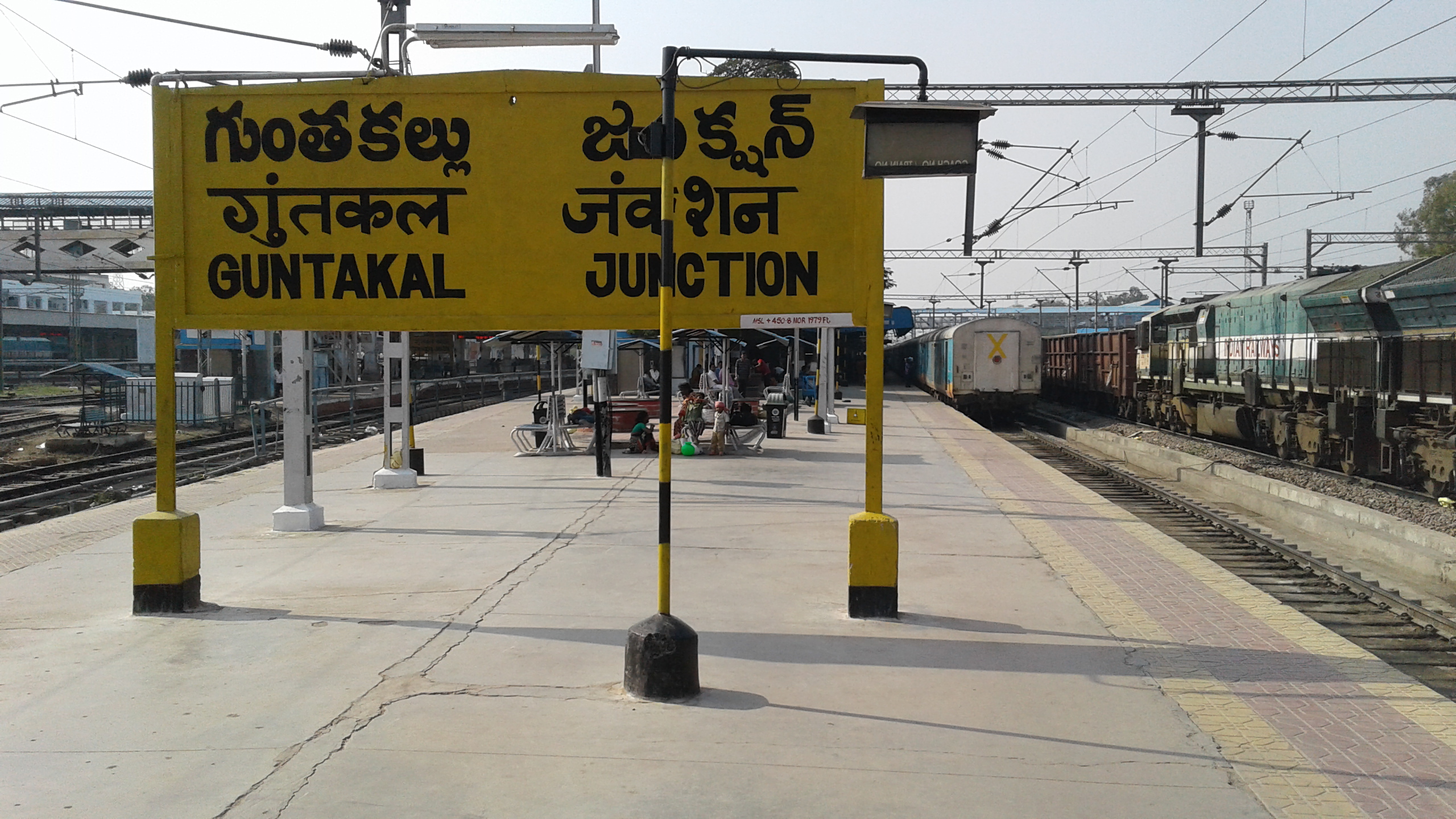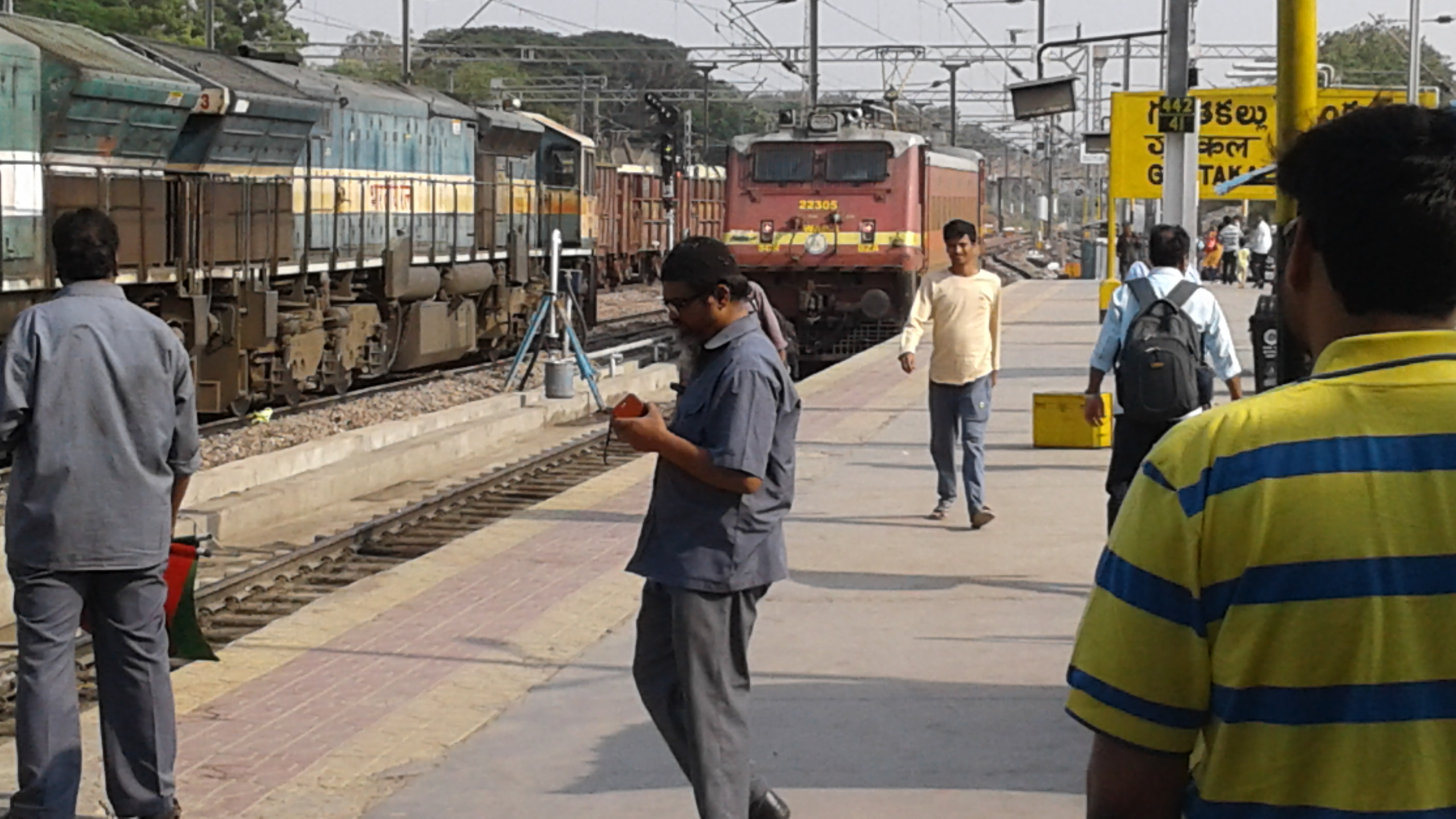 I had a heavy but tasty lunch (from the pantry) comprising jeera rice and 2 chapatis with vegetable gravy, panneer mutter, dal and curd. It was expensive though; at Rs. 155. We skipped Adoni at a good pace with continuous HT honking by our diesel. An express led by a diesel loco crossed us after Aspari. Then there was contrasting scenery in the form of arid land with some green patches, ponds and goats, lambs and sheep grazing (as well as windmills! ) before Molagavalli. We overtook another BOXN rake headed by twin WDG4s (leading – 12969 of KZJ) at Nemakallu. Reached GTL (Platform 6) at 14 31, 14 mins early 🙂 .