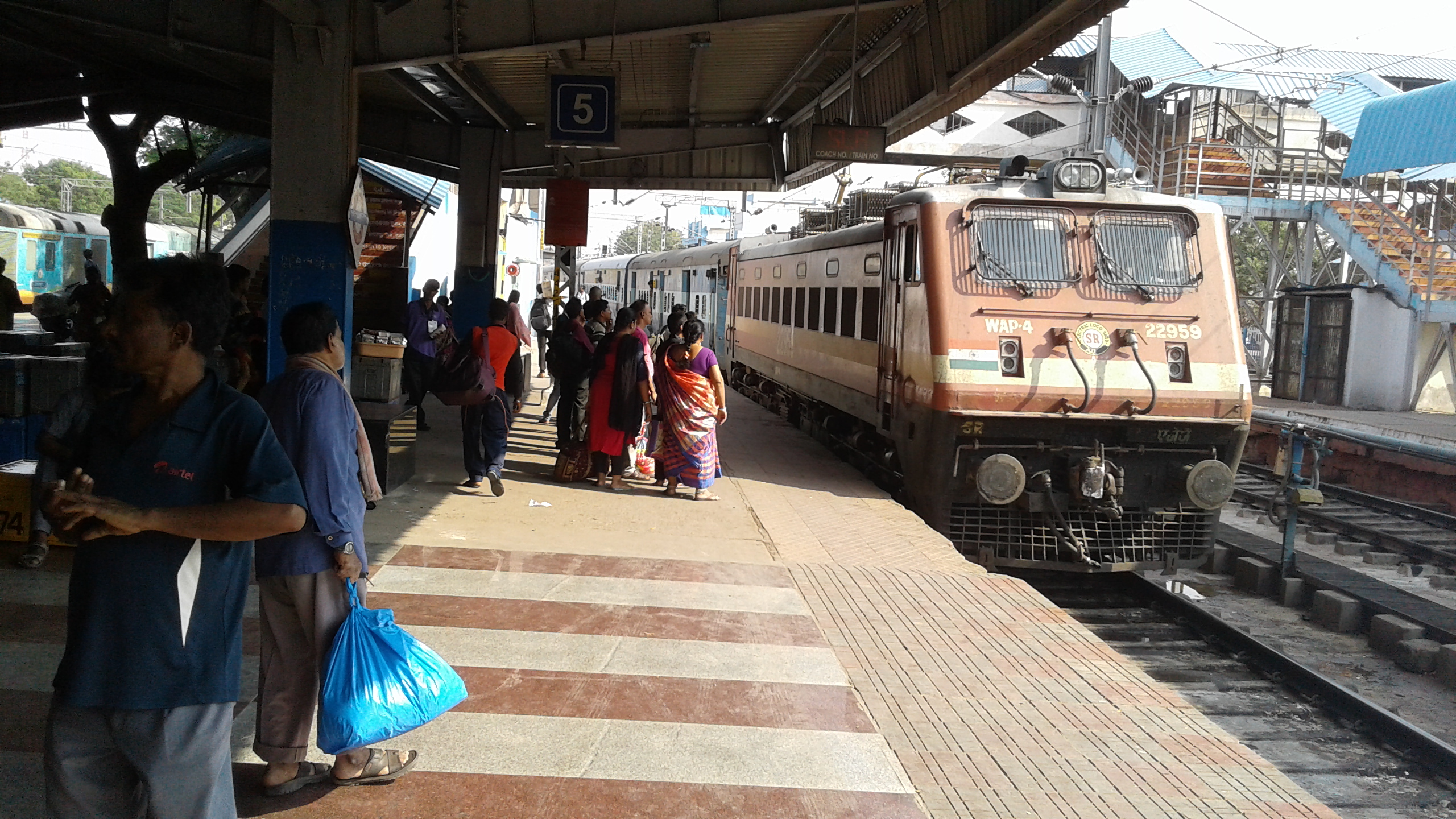 So, halfway through my first experience by the ‘Humsafar’ class of trains (in this case being 22920 ADI-MAS Humsafar); we departed Raichur right on the dot at 12 45. For our progress from Mumbai please refer Part 1: https://ashwinkumar1989.online/2018/12/28/my-first-ever-humsafar-experience-part-1/ . I spotted WAG9H 316X2 and KJM WDP4D 40454 on a siding in the left. The time on the display board inside the coach was 7 mins too fast! 😛 We passed through maize and corn fields as well as ponds before Marichethal.