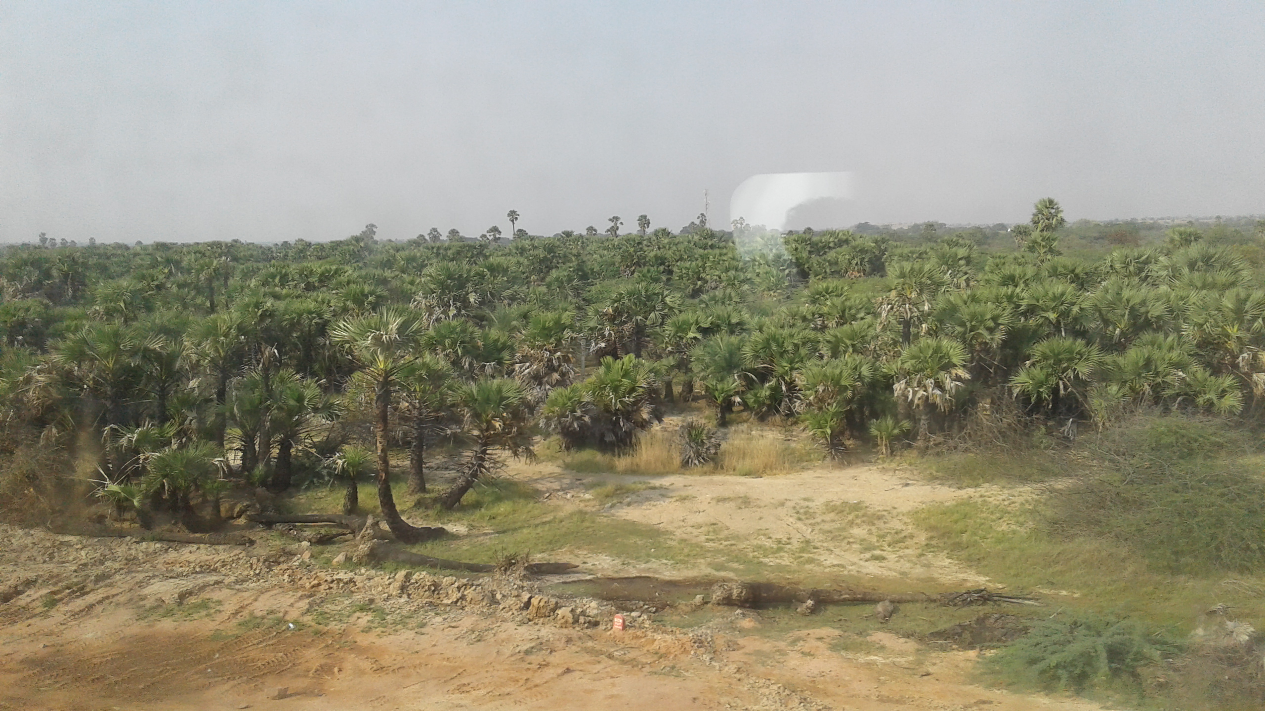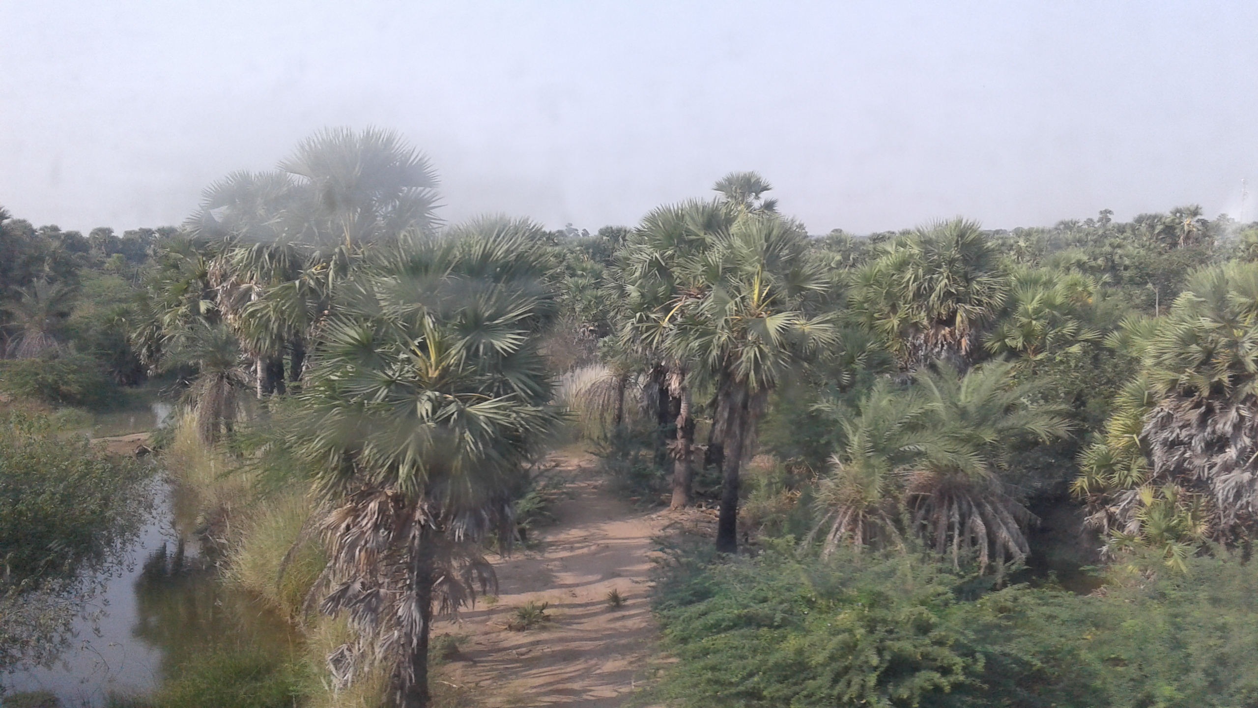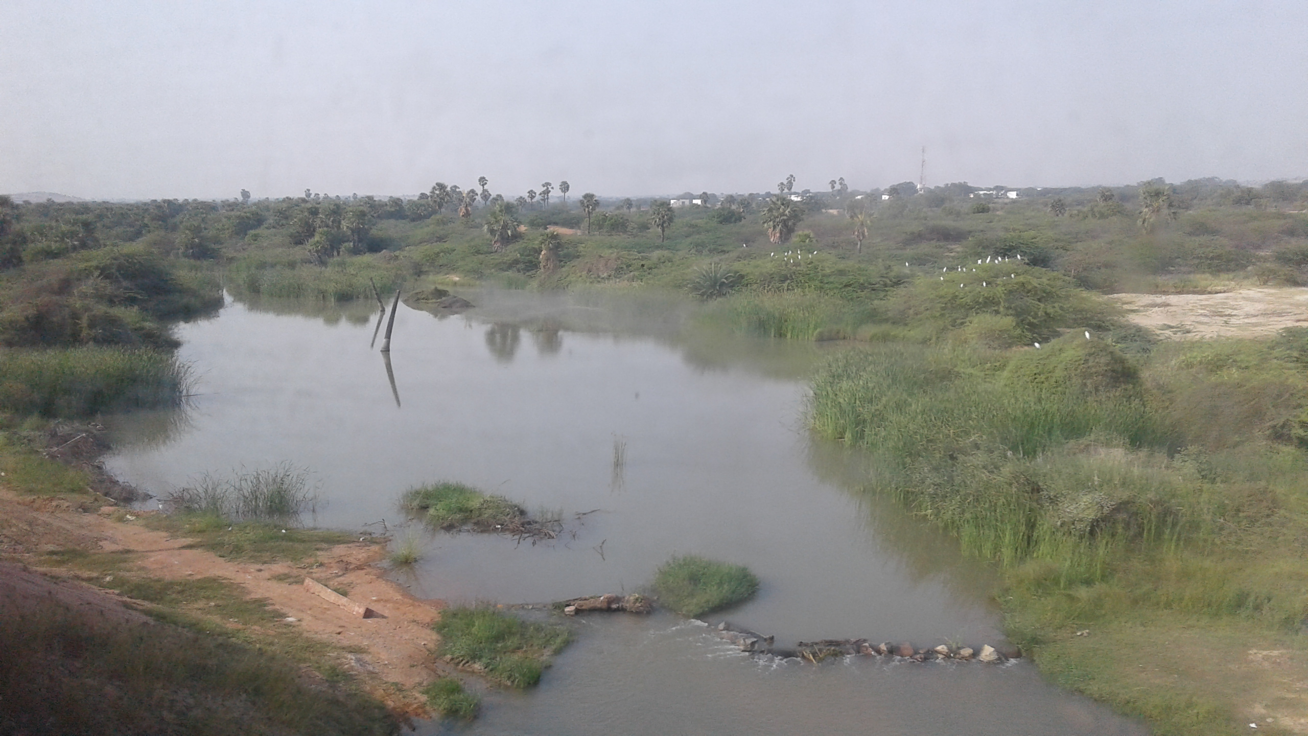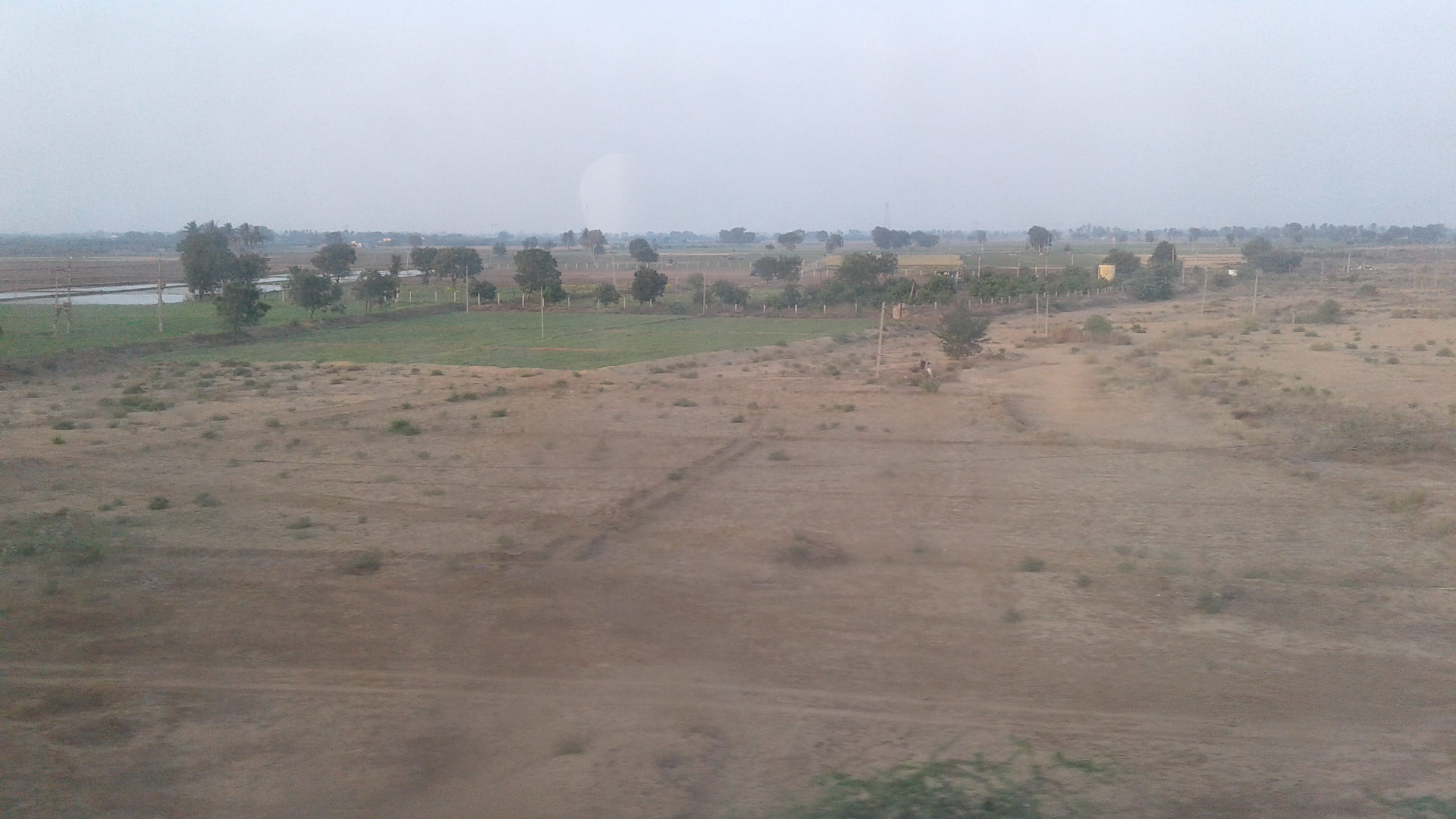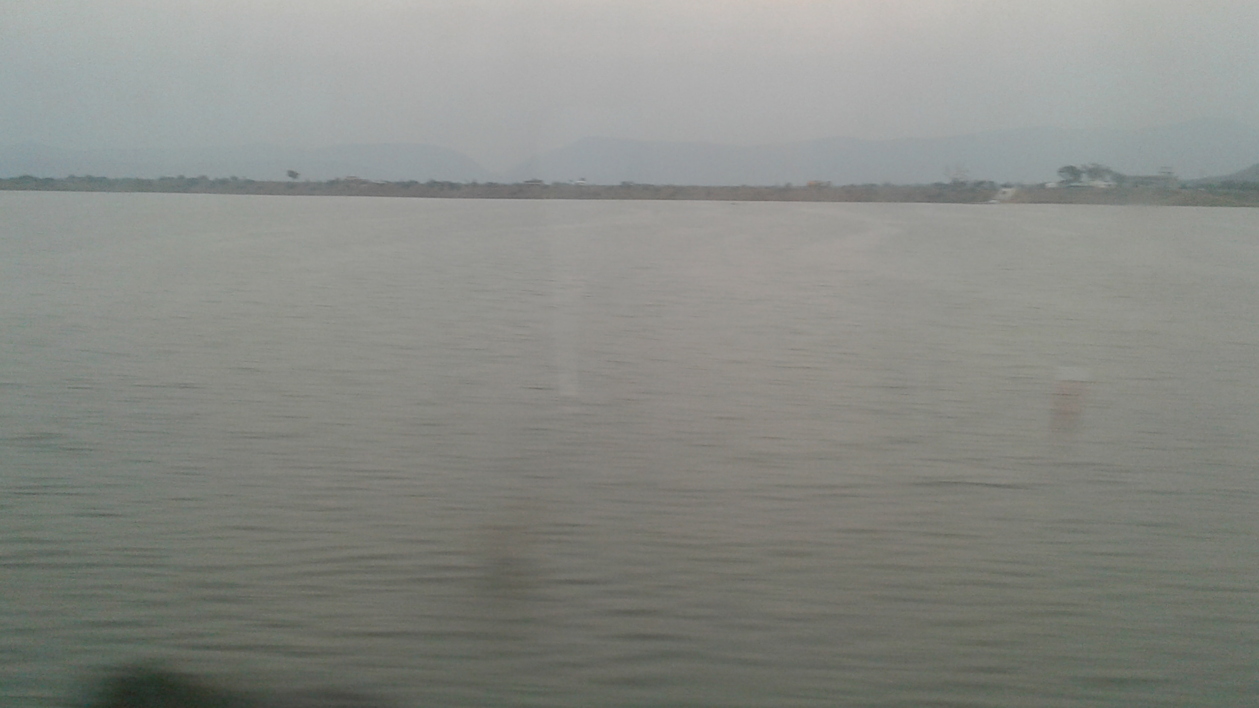 We finally departed at 14 58 (3 mins late) after a long halt of 27 mins, with 2 blasts of the HT horn. Electrification seems to have started on the route to Kurnool. We passed through green fields and cow sheds with cattle grazing before Nakkanadoddi. Then there was a pond full of moss and weeds, followed by a beautiful lake.