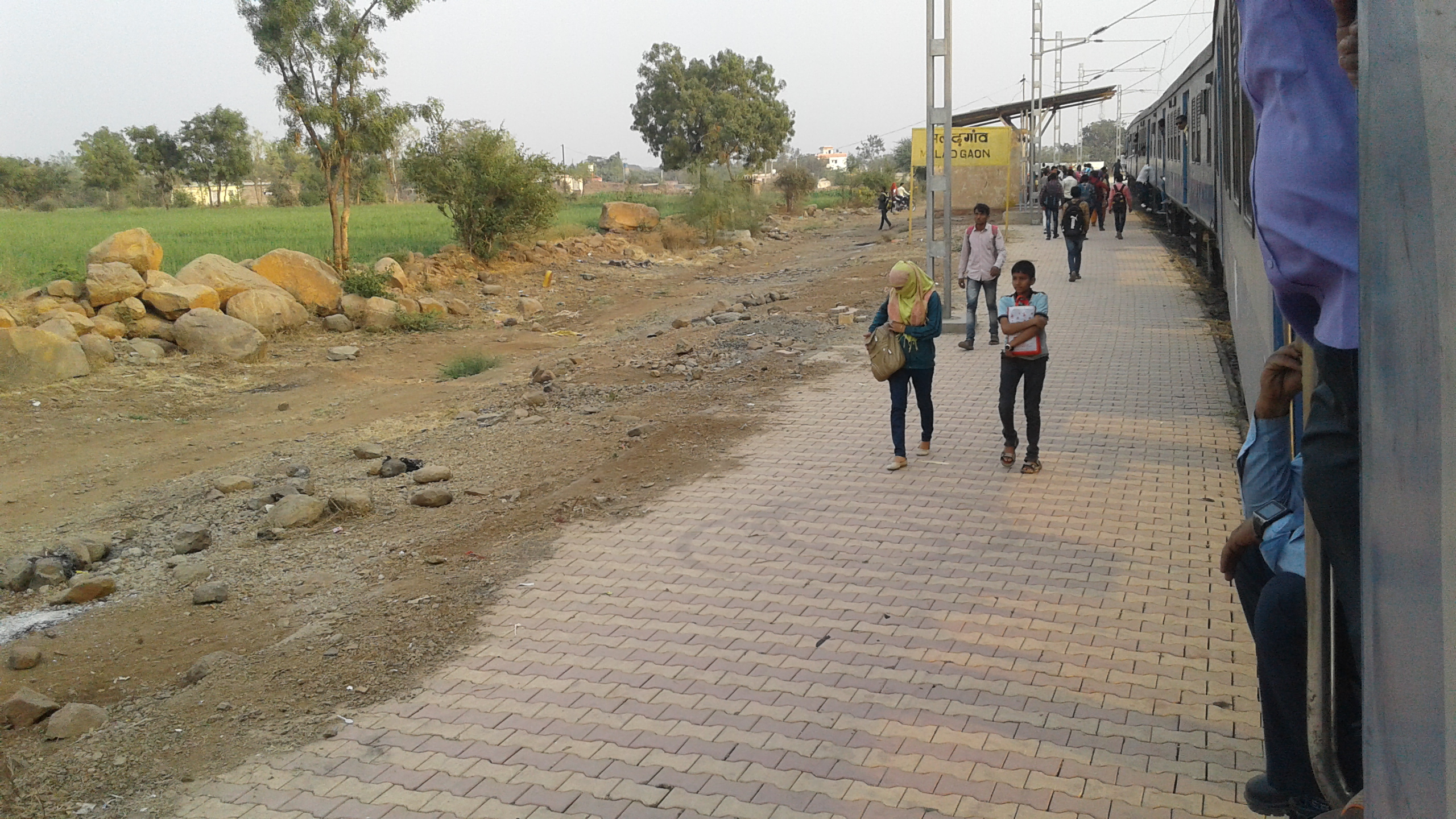 There was typically charming countryside scenery till the next station Maladgaon β cow sheds with cattle, huts, cottages, a water tank, goats, lambs and sheep grazing, sugarcane and maize fields, rows of small trees, women growing onions in a field and dry canals. We had a stop of 50-odd secs at the quaint little Maladgaon station.