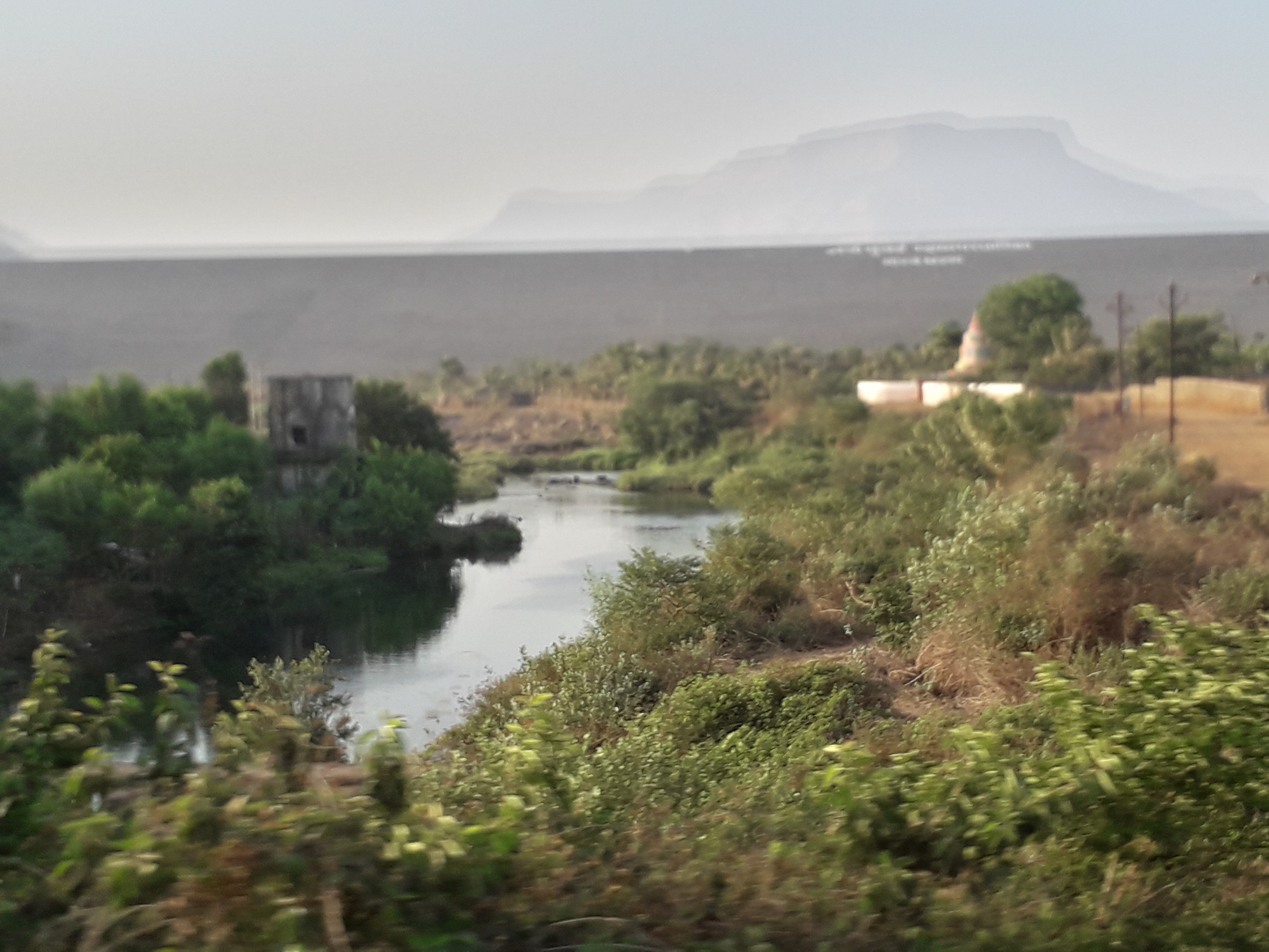 Following a short tunnel, we slowed down; before picking up speed again quickly and ripping through Chowk, horns blaring. Then we crossed another river with a dam (with the letters “Navi Mumbai Municipal Corporation” written in Hindi) in the distant left.