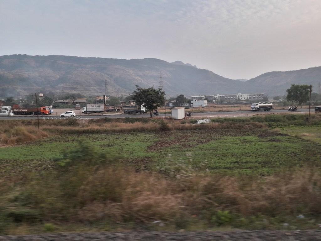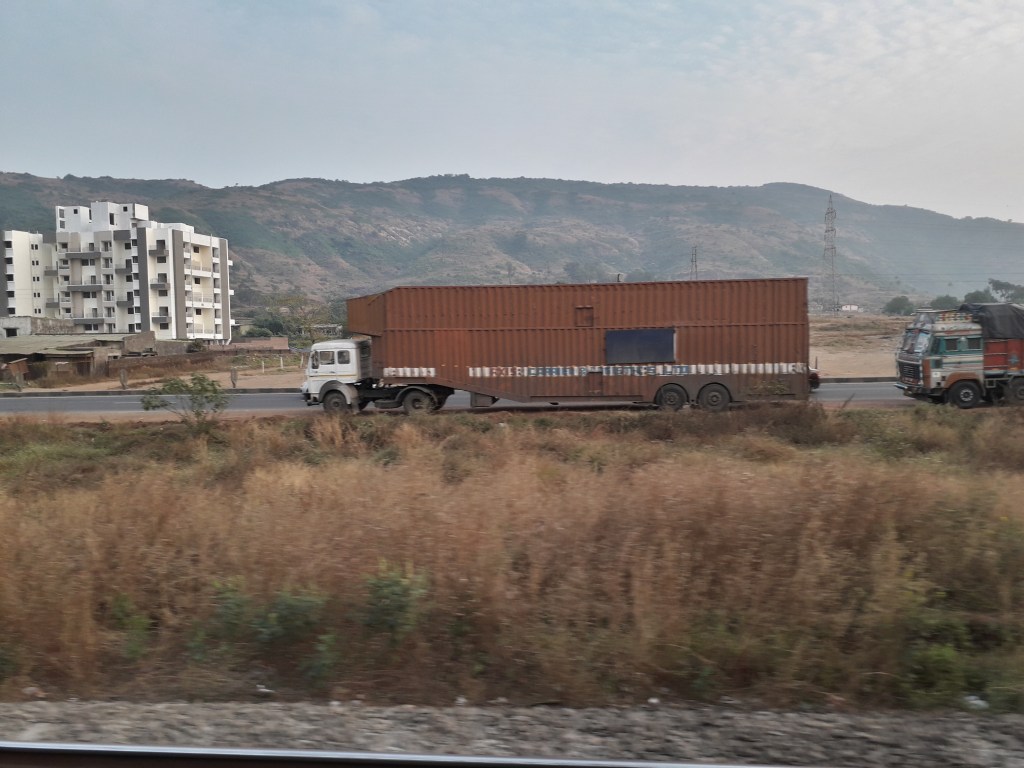 We reached Lonavala at 17 20, 53 mins late. Departed after a halt of 3 mins, with a short HT horn. We then crossed a container rake headed by BL WAG5Hs 23295 and 23841; as well as a KYN WDG3A ‘Shakti’ with another such rake. Soon our WDP4D was in its element, as we quickly accelerated to MPS; blasting through Malavli and racing vehicles on the Mumbai-Pune Expressway – accompanied by HT honking and rhythmic clickety clack track sounds. Here are pictures of us racing vehicles on the Expressway, as well as a trailer truck, as we slowed down to a crawl: