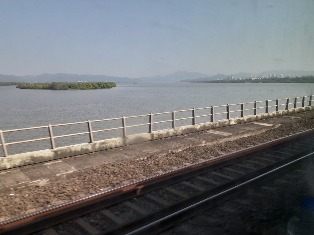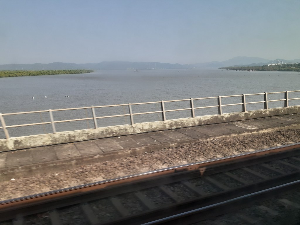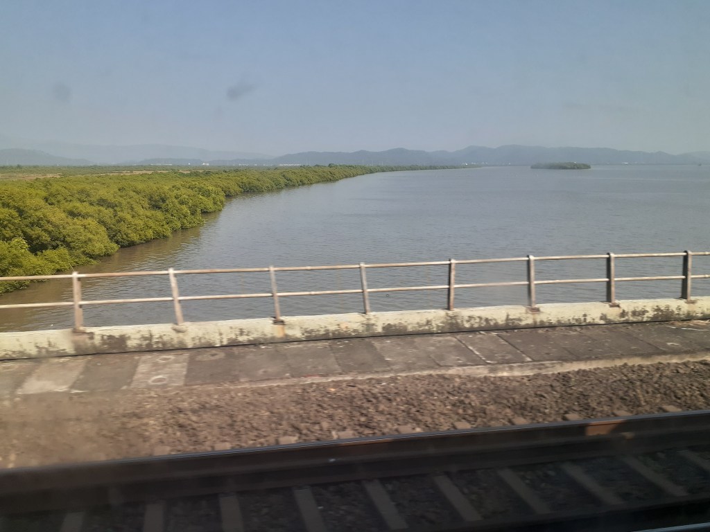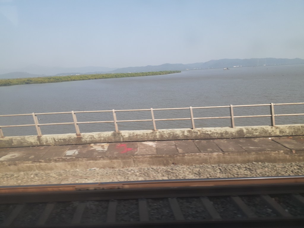 12926 ASR-MMCT Paschim Exp crossed at a great speed with a BRC WAP7 just before Kandivali. We stopped at BVI home signal with a big jerk that caused two water bottles to fall! :O Departed a minute later with another big jerk!! Pulled into PF6 of the station at 15 05, 13 mins late. An unknown special to BDTS departed from PF9 behind BL WAG9 31551. Meanwhile, a lot of people got in our train. We left after a halt of 4 mins; with yet another big jerk. I have experienced a lot of LHB jerks and they are particularly irritating when the train is hauled by a WAP7! 😦 By the way, you will have to wait till Part 2 for a video compilation of the journey as a whole; including all the high speed action post Virar, as well as some of the rivers. Meanwhile, the flush in the Indian toilet was not working 😦 . We then passed over the Vasai Creek, which, as always; was a sight for sore eyes 🙂 .