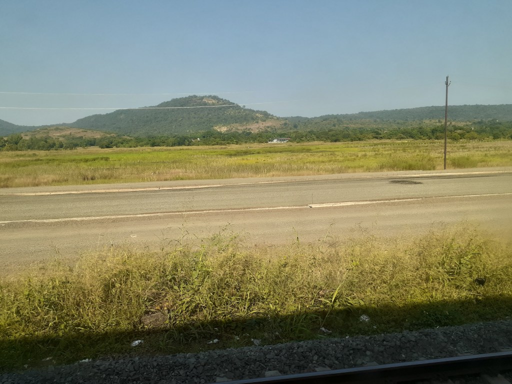 The scenery continued to grace us with its presence – coconut groves in the distant right, followed by plantains, palm trees and a stagnant pond. Then we blasted through Gholvad and crossed a BOXN rake led by twin WAG7s. This was followed by forests with small coniferous trees, coconut groves and meadows; before we ripped through Bordi Road. Then there were more cone trees, eucalyptus trees and coconut groves; with mountains in the distant right. 19016 Porbander Mumbai Saurashtra Exp (now terminating at Dadar) crossed us behind a WAP4, before we thundered through Umbargaon Road – now we had finally entered Gujarat 😉 . The freight action continued, as we crossed a container freight pulled by a WAG9. Then we passed over another river before blasting through Sanjan. The scenery continued inexorably in the form of coconut groves, small forests and eucalyptus trees. A line branched off to our right.